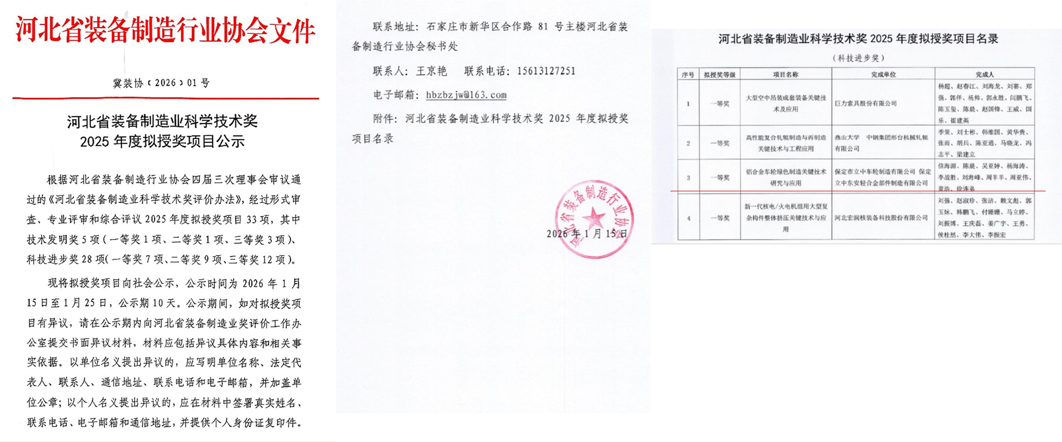 2026年1月15日,河北省装备制造业科学技术奖2025年度拟授奖项目公示,由保定市云顶国际车轮制造有限公司和保定云顶国际东安轻合金部件制造有限公司共同完成的“铝合金车轮绿色制造关键技术研究与应用”项目,荣获科技进步奖一等奖。